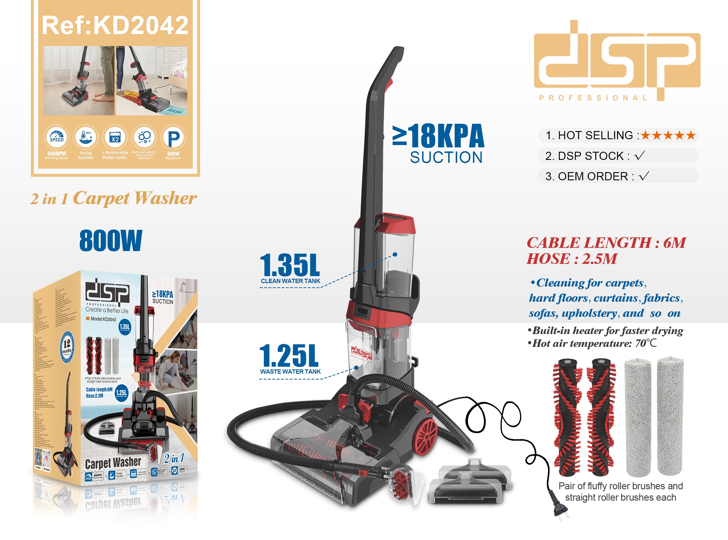 Accessories: Cleaning tools, air brush + hose (2.5 meters), inhalable front cover (for carpets), inhalable front cover with mop (for hard floors), a pair of soft roller brushes and a pair of straight roller brushes each.