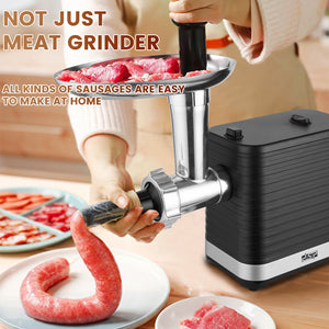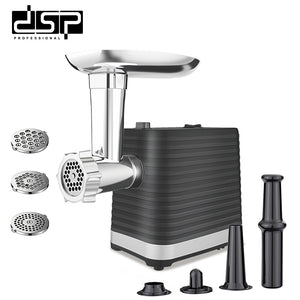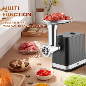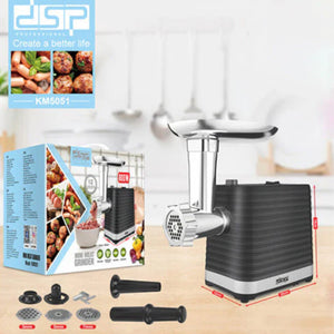 - الملحقات: 3 أقراص قطع معدنية (3 مم، 5 مم، 7 مم) + مرفقات لعمل السجق والكبة + دافع الطعام