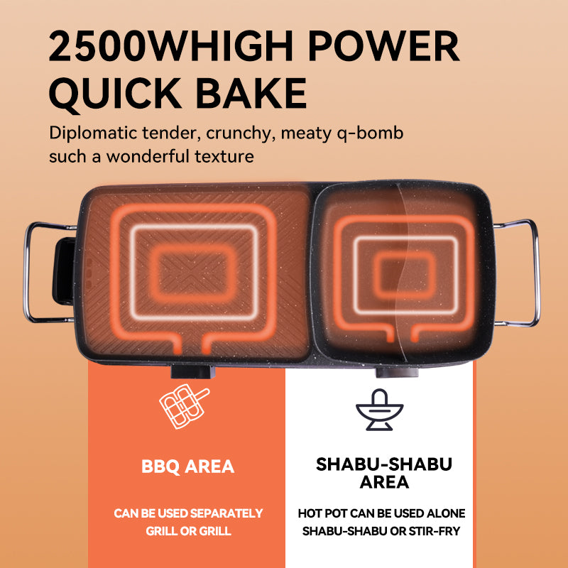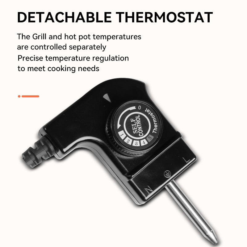 The durable aluminum construction and PTFE non-stick material ensure effortless cooking and easy cleanup. Enjoy smokeless grilling with the dismountable oil collector and non-stick cooking surface. With separately adjustable temperature controls for both the grill and hot pot, you can achieve precise cooking results every time.