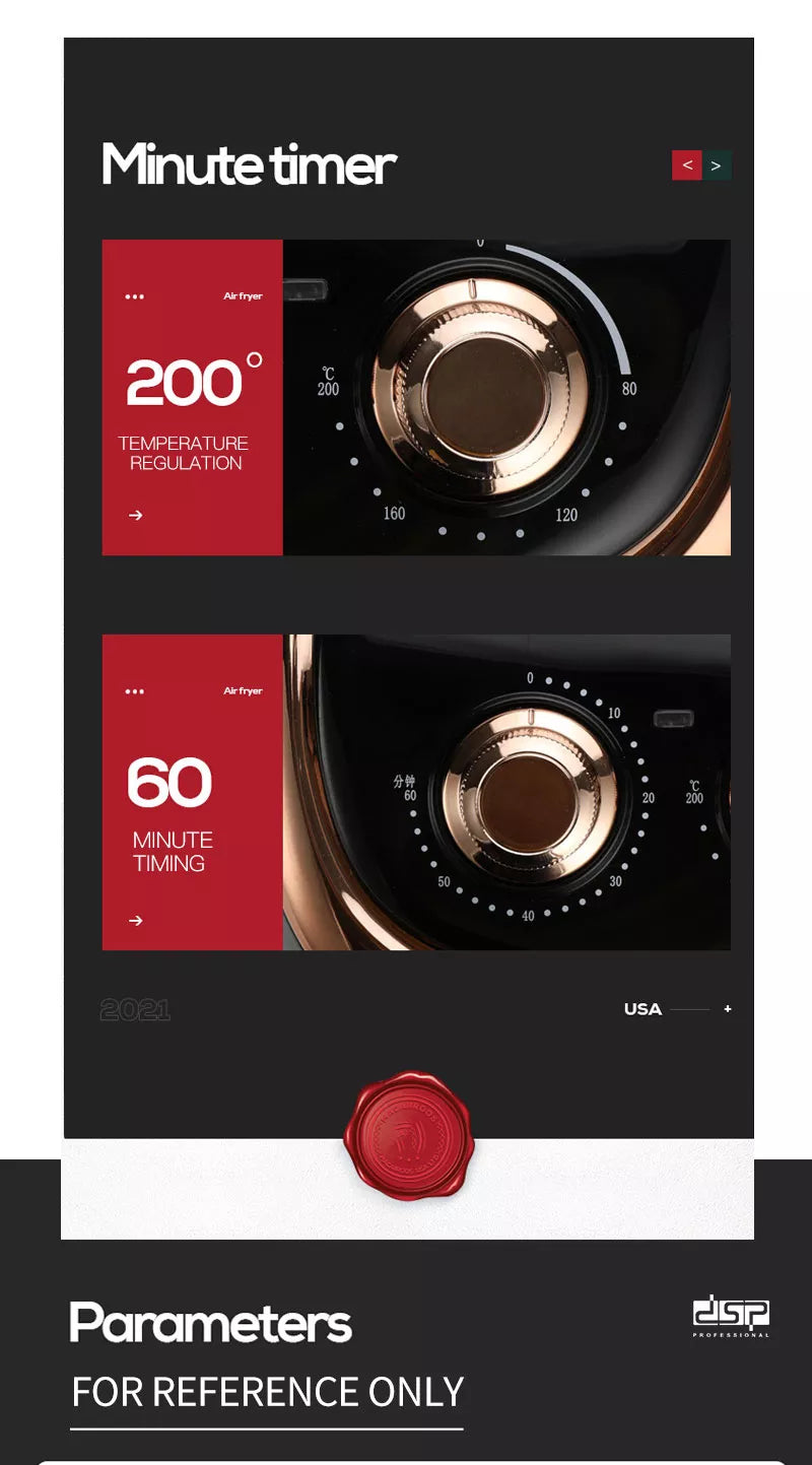 - The DSP air fryer features a timer with auto-shutoff for added convenience. Additionally, this air fryer has a working time of 0 to 30 minutes and a temperature range of 65°C to 200°C.