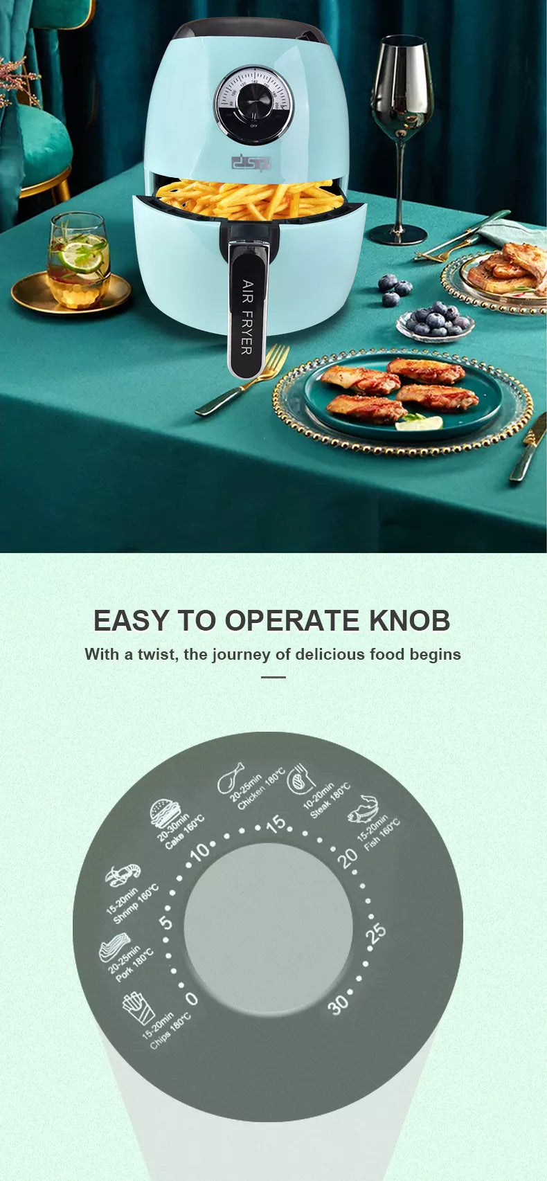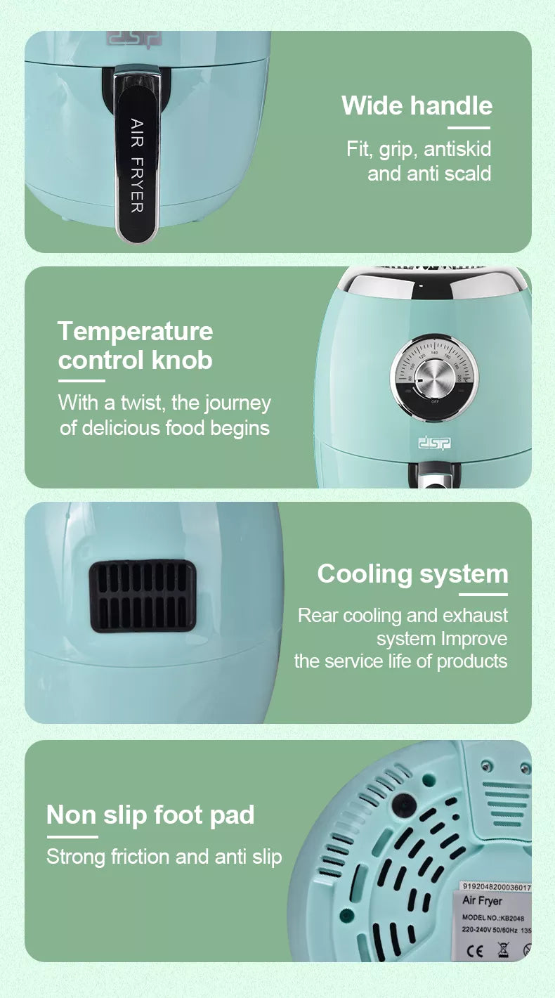 - The DSP air fryer features a timer with auto-shutoff for added convenience. Additionally, this air fryer has a working time of 0 to 30 minutes and a temperature range of 65°C to 200°C.